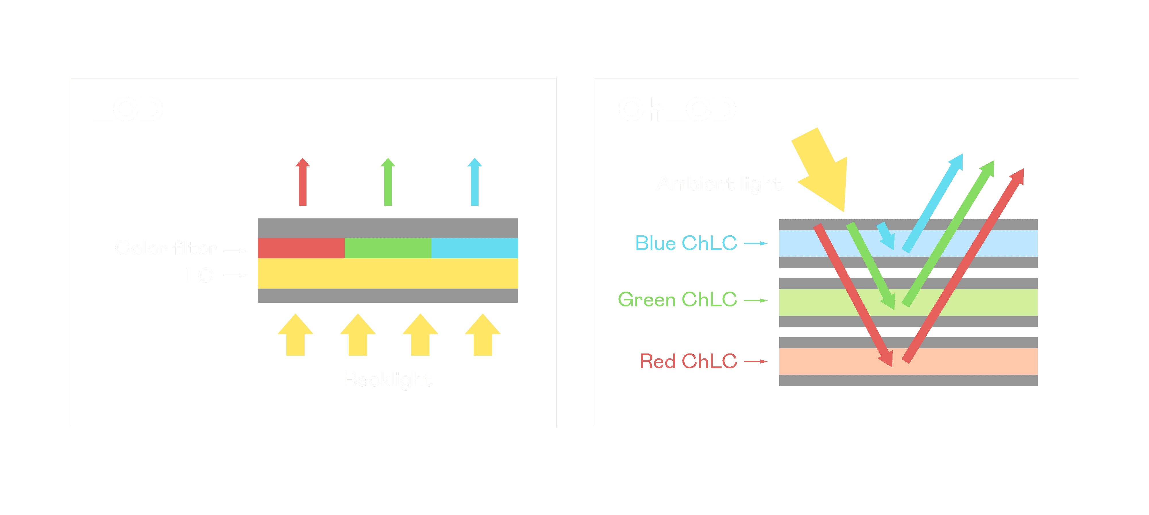 ChLCD 胆固醇液晶就如同纸张一样,,,透过反射环境光来显示影像,,,因此长时间观看不易造成人眼视觉疲劳,,,,可达到护眼效果。。。当处于户外阳光下使用,,,,LCD 影像容易失真而不易观看,,,但胆固醇液晶仍可维持较佳的影像品质。。。。